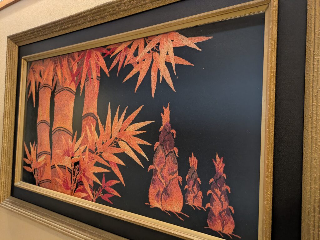 当館の廊下を歩いていると、ふと目が合う鮮やかな朱色の竹。 「素敵な絵画だな」と通り過ぎようとして、ふと足を止めてみてください。 実はこれ、筆で描かれたものではなく、一本一本の「糸」で丁寧に編み上げられた刺繍作品なんです。近くで見ると、糸な... -