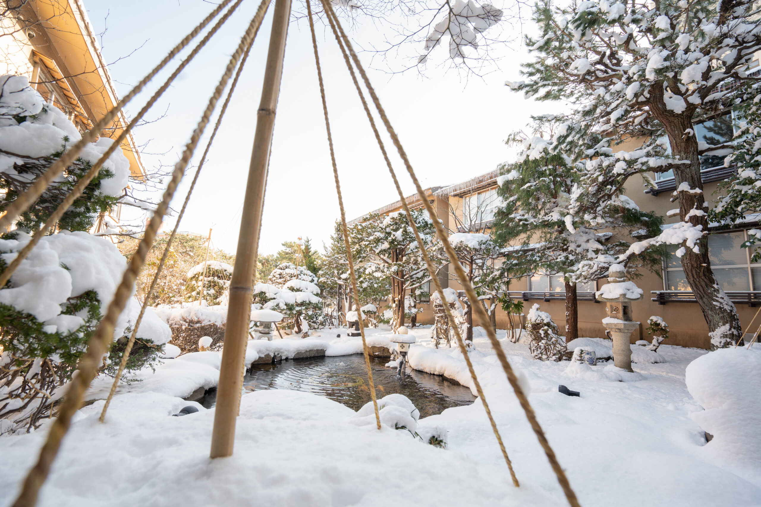 白く積もった雪の上を、池の鯉がゆったりと泳ぐ姿は、この季節ならではの風景です。館内のどのお部屋からも眺めていただけるので、あたたかいお部屋でお茶を飲みながら、静かな冬の庭をお楽しみください。寒い季節だからこそ感じられる、ほっとするひとときです。